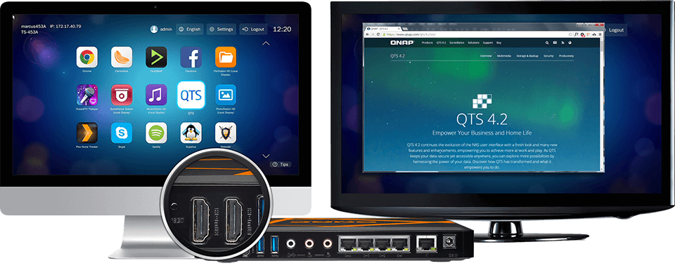 TBS-453A 支持 QNAP 的 QvPC 技术,并配备 2 个 HDMI 输出,您可选择「镜像」或「延伸」两种输出模式。采用镜像模式,可同时在两个不同的显示器上输出相同画面;延伸模式则以连续桌面的方式呈现输出的显示器画面,可将应用程序从一个显示器画面中拖曳至另外一个使用,享受多屏输出的便利,提升工作效率。