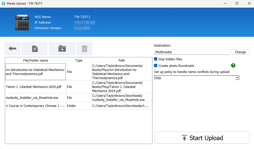 可将文件和文件夹上传到 QNAP 设备。