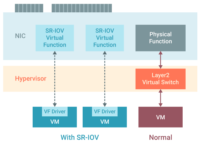 TS-h2490FU 安装支持 Smart NIC SR-IOV (Single Root I/O Virtualization) 技术的 PCIe 网卡,将实体网卡的带宽资源直接分配给虚拟机,大幅降低 Hypervisor 的 CPU 负载,减少网络带宽耗损,且提升网络效率及稳定度。