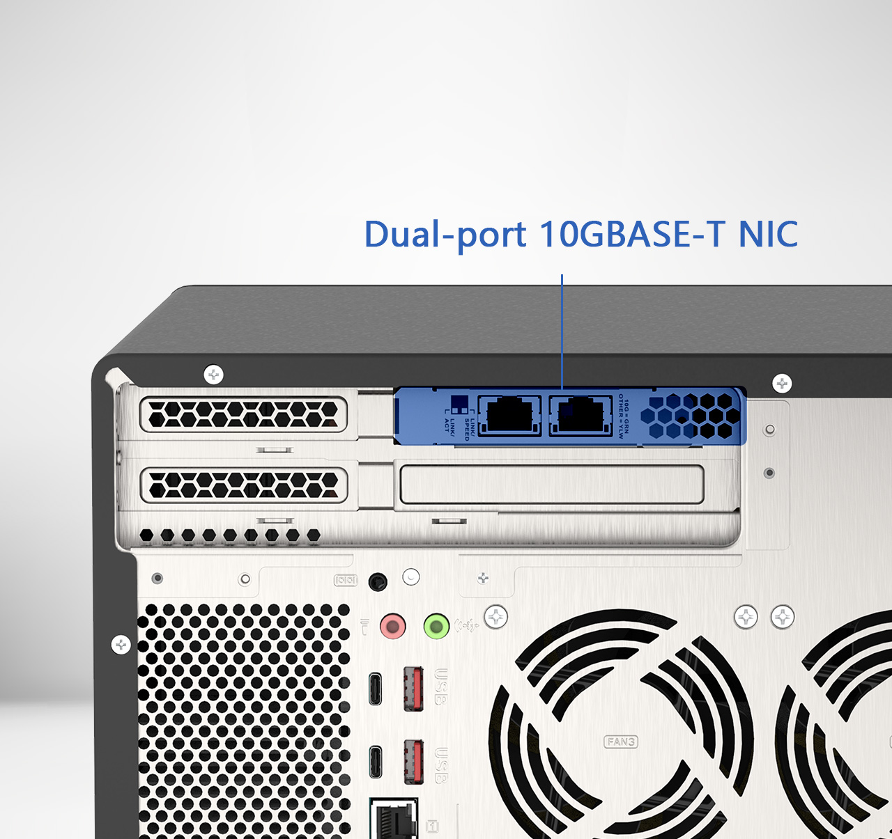 2 个 10GBASE-T 与 4 个 2.5GbE 网络端口,加速虚拟机应用、密集档案存取、高速备份/还原、以及影音传输。