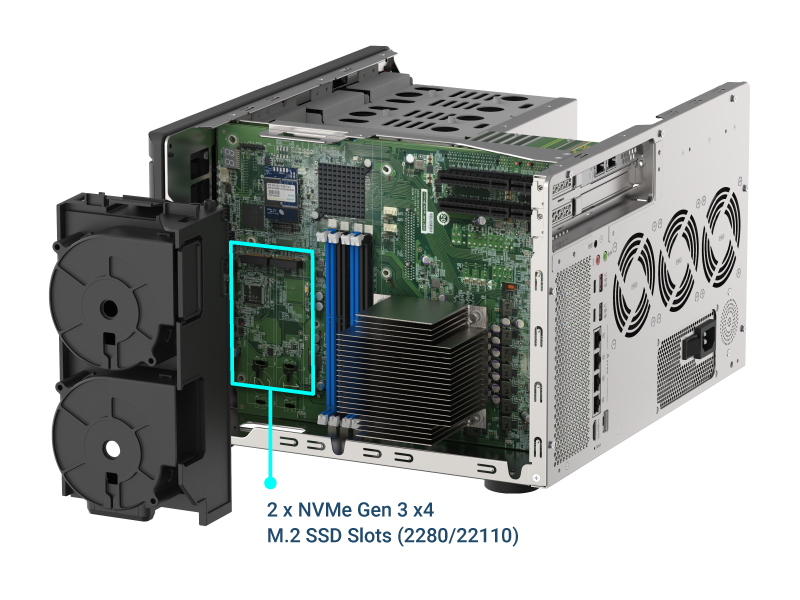 TVS-h1288X 内建 4 个 2.5 英寸 SATA 6Gb/s SSD 专用槽与 2 个 M.2 NVMe Gen 3 x4 SSD (尺寸 2280/22110) 专用端口,可弹性配置 SSD 快取加速,提升磁盘随机存取效能、减少 I/O 延迟,尤其适合高度 IOPS 效能的应用 (如:数据库、虚拟机),亦可激升 2.5GbE/10GbE 理想访问速度。无需占用 3.5 英寸硬盘槽,轻松享有存储空间扩大化、效能优化的好处。