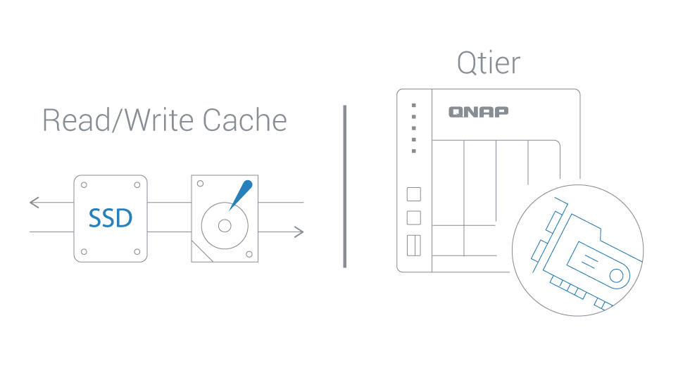 为您的 NAS 添加 SSD 快取或启用 Qtier (QNAP 的自动分层技术),提升整体系统效能并最大化存储使用状态。