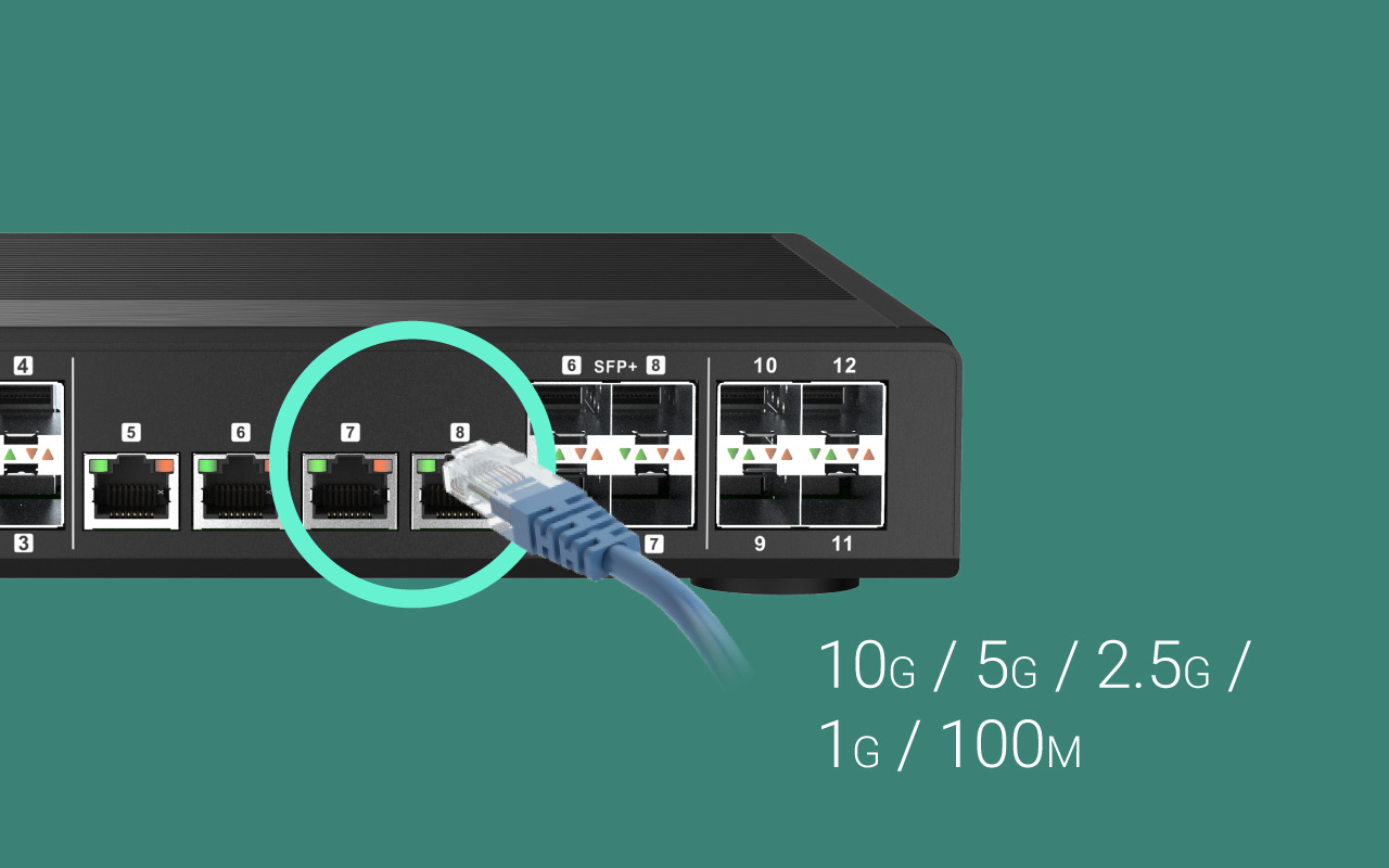 具备 8 个 10GbE SFP+ / RJ45 复合端口,兼容 Multi-Gigabit NBASE-T 标准,可支持达五速 (10G / 5G / 2.5G / 1G / 100M) 网络,使用原有线材即可升级网速。