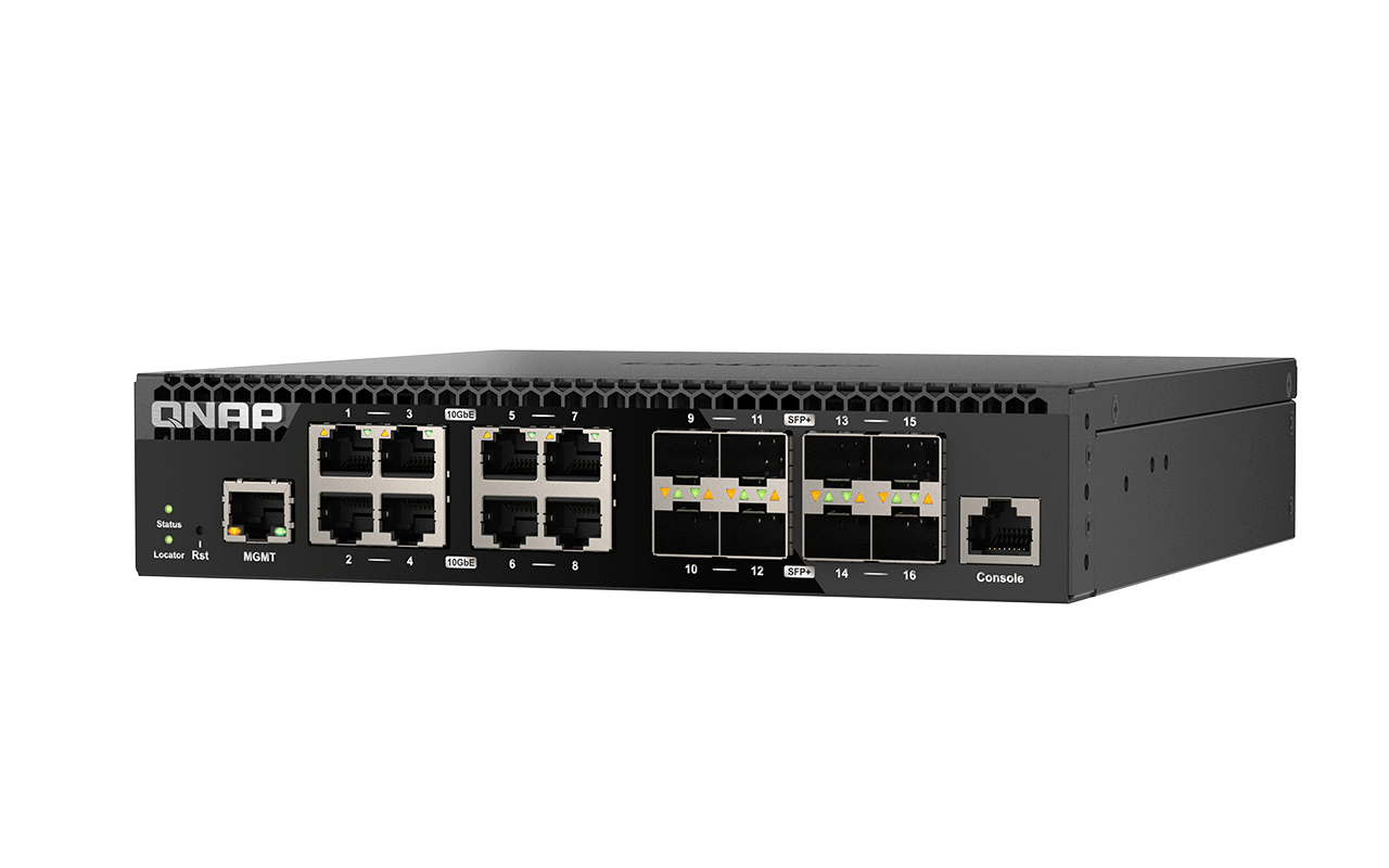 QSW-M3216R-8S8T 具备 8 个 10GbE SFP+ 光纤端口及 8 个 10GbE 以太网络端口,可灵活连接光纤 (SFP+) 及铜缆 (RJ45) 两种不同接口的网络设备到同一台交换机,满足 SOHO 办公室或中小企业室的高速网络配置,实现流畅的文件传输、虚拟机应用、或多媒体影音播放及分享。使用 RJ45 接口时,可使用 Cat 6 以上线材,支持 Multi-Gig 至最高 10GbE 网络传输速度,让数据传输更有效率;亦提供低速联机,向下兼容于传统设备。