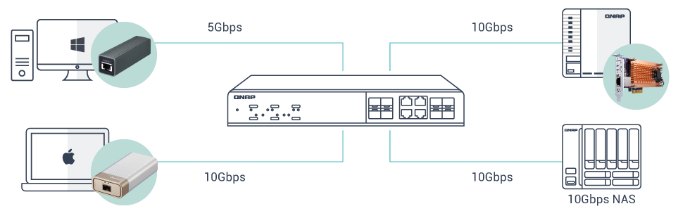 10GbE 网络提供您更高速、流畅的数据传输体验。QNAP 旗下多款 NAS 机种支持 10GbE 网速,您网络环境内的 Mac®、Windows® 计算机亦可搭配 QNAP 10GbE 网络扩充卡、QNAP USB 3.2 Gen 1 对 5GbE 网络转换器,或是 Thunderbolt™ 3 对 10GbE 网络转换器大幅提升网速,所有装置连接 QSW-M804-4C 可将网络环境 多元升级 5GbE/ 10GbE 速度,让多个工作站可同时直接存取大型档案 (特别适合影音编辑和多媒体应用),或提升高带宽作业 (例如虚拟化应用) 的效率,为中小企业以及媒体工作室打造经济实惠的高速网络传输环境。