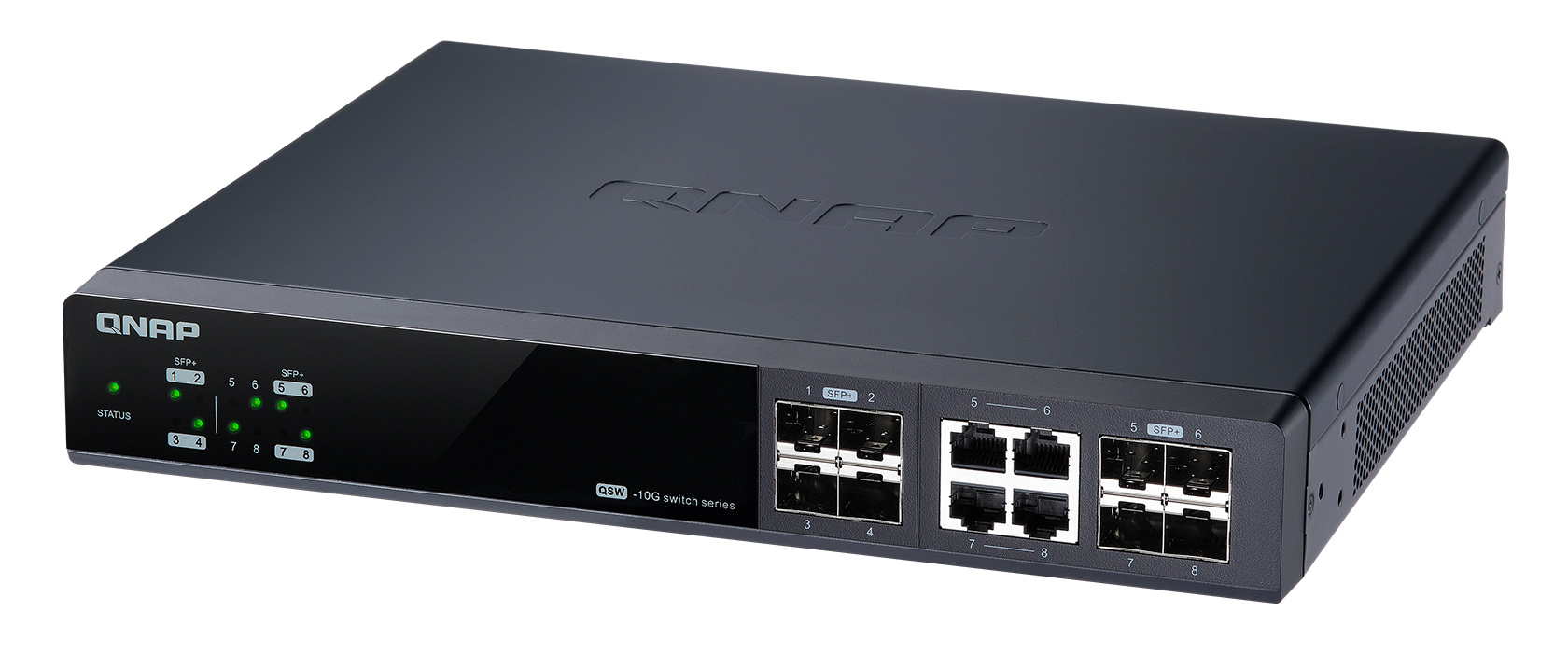 QSW-M804-4C 8 端口管理型交换器,内建 4 端口 10GbE SFP+ 光纤端口,及 4 端口 10GbE SFP+ / RJ45 复合埠,支援 (L2) 网管功能,提供非专业 IT 人员皆可快速上手的入门网管解决方案。QSW-M804-4C 配备全 10GbE 高速网络,与同级机种相比,价格亲民,您只要小小的付出,就能拥抱 10 倍网速带来的全新快感,高性能与高性价比一起满足。QSW-M804-4C 10GbE 网络环境亦提供您更高速、流畅的数据传输体验,让多个工作站同时直接存取大型档案,或提升高带宽作业的效率,以突破性的低成本轻松打造高速网络协作环境。