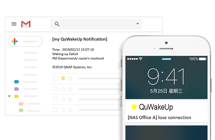 跨平台通知:当出现意外关机、联机异常或唤醒失败等异常情况发生时,24 hr 监控设备运作情形的 QWU-100 即能透过电子邮件或行动装置推播,让您第一时间接收通知,实时处置意外情况。