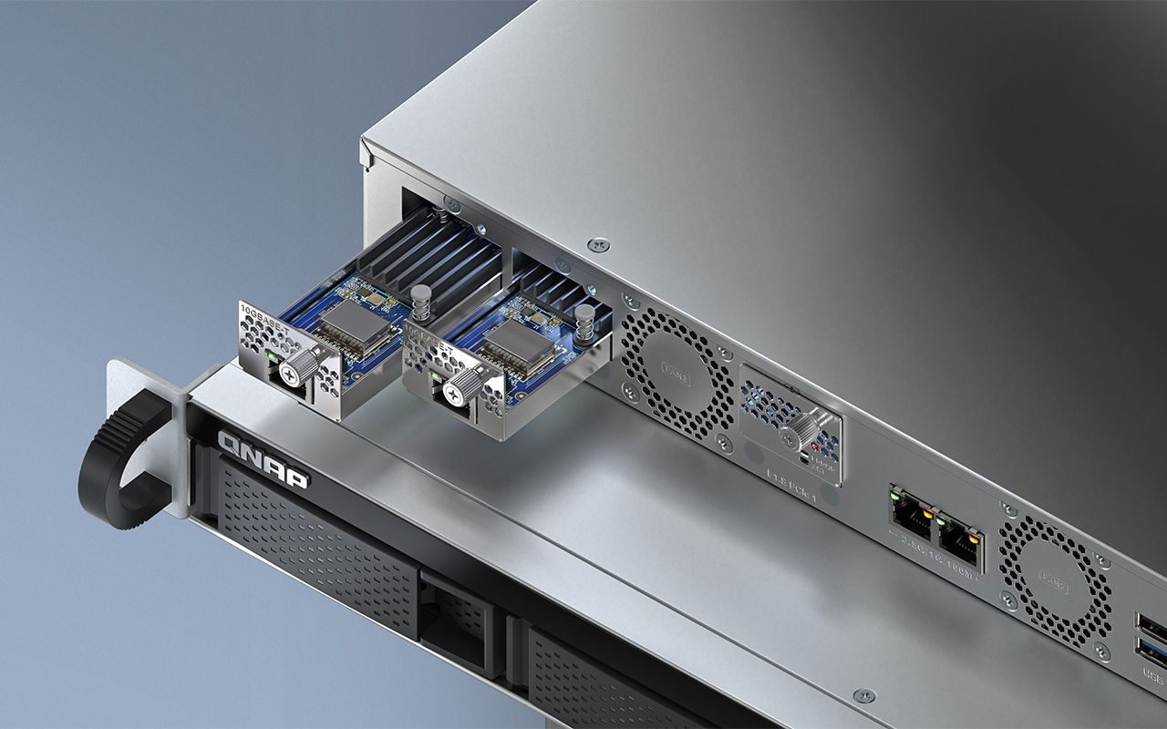 为 NAS 安装 QXG-ES10G1T 网络扩充模块,再搭配 QNAP 旗下多款 10GbE 交换机,用精省的预算打造大带宽高速网络环境,加速企业关键任务运作。