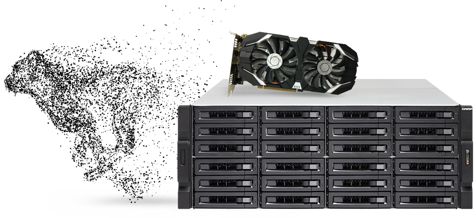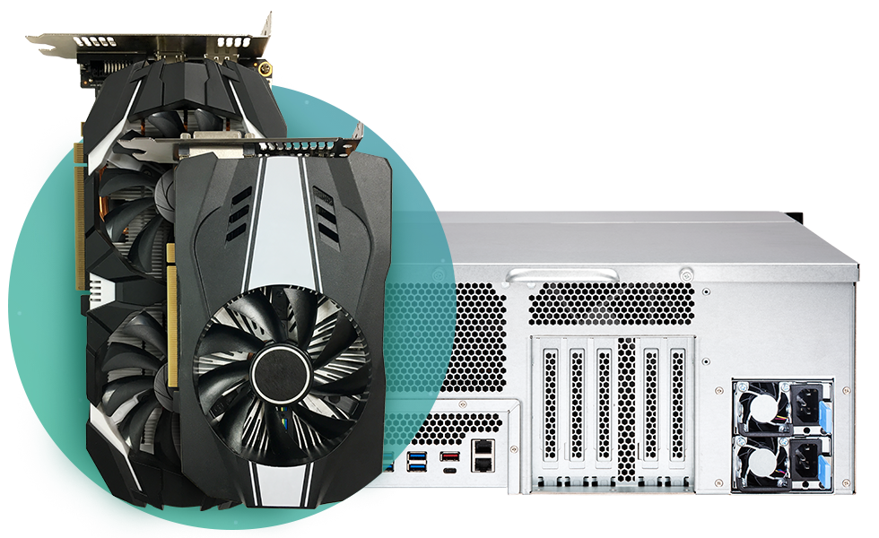 TS-2477XU-RP 提供 4 个 PCIe 扩展槽,可让您安装 2 张高阶图形显示适配器,双卡并行,激发比单张显示适配器更强大、丰厚的绘图运算能力,不仅加速 NAS 图像处理与 GPU 运算效能,还可大幅推升处理庞大人工智能学习数据的运算能力,更支持虚拟机 GPU Passthrough 应用,让 NAS 为您完成更多任务。