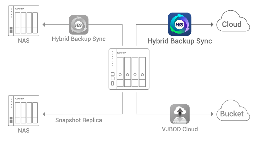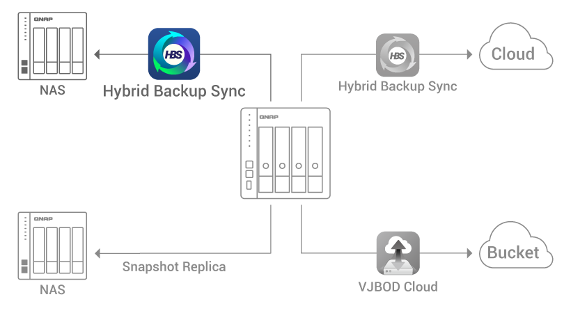 Hybrid Backup Sync (HBS) 结合了备份及同步功能,让您轻松从 TS-464C2 传输数据至本地、远程或云端存储空间。HBS 还支持 QuDedup 技术,可在数据源端进行重复数据删除,进一步加速备份及还原作业,并节省实际存储容量。