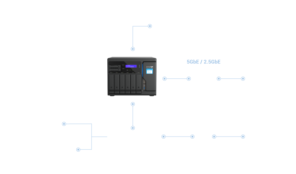 TS-855X 内置 2 个 2.5GbE (2.5G/1G/100M) 及 1 个 10GbE RJ45 (10G/5G/2.5G/1G/100M) 网络端口,满足企业对虚拟化应用以及大量文件存取、备份和复原等高带宽作业的需求;您可为双 2.5GbE 网口设置 SMB 3.0 Multichannel (多重信道),聚合网络带宽可实现 5 Gbps 的网速加乘与稳定的网络容错备援。搭配 QNAP 旗下多款网管型和非网管型 2.5GbE/10GbE 交换机,用精省预算打造流畅、安全、可扩充的高速网络环境。