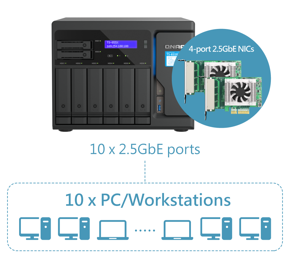 TS-855X 内置双埠 2.5GbE,搭配 PCIe 弹性扩充 2 张 4 口 2.5GbE 网卡 (QXG-2G4T-I225),不须通过交换机,即可直连多达 10 台 PC/工作站,满足流畅大文件传输及备份、多人实时影像剪辑等需求,团队工作效率更高。
