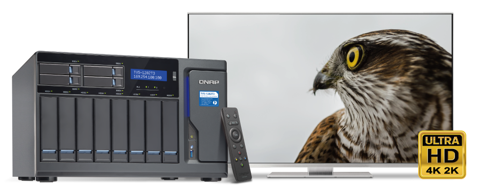 TVS-1282T3 提供三个 HDMI 输出接口 (4K 30Hz),支援「鏡像」或「延伸」兩種輸出模式*,亦可连接 HDTV 或 A/V 扩大机,搭配 HybridDesk Station (HD Station) 内建的媒体播放器,直接欣赏 TVS-1282T3 里的丰富影音文件,享受画质清晰的 4K 影片。HD Station 支持用户登录机制,确保仅有被授权的用户才可通过 HDMI 外接屏幕访问 TVS-1282T3 上的数据;另支持同时开启多个应用程序、多国键盘及输入法,使用上就像个人计算机一样。您可利用附赠的 QNAP 遥控器轻松操作 HD Station,或在行动设备上安装 Qremote 应用程序,轻松遥控娱乐体验,藉由 QButton 功能,更能让您随心设定按键功能,播放 NAS 歌曲列表、监看摄影机频道或是重启关闭 NAS变得更简单,让您享受便利的 NAS 数位生活体验。