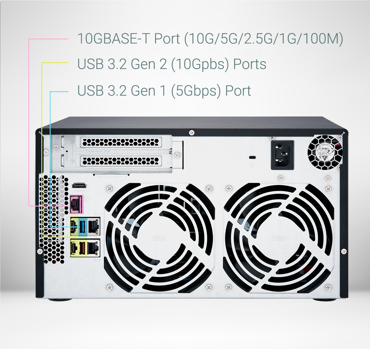 TVS-872X 提供 2 个 Gigabit 及单端口 10GBASE-T 网络端口 (支持 10G/5G/2.5G/1G/100M 五速传输),满足企业对虚拟化应用、大量文件存取、备份和复原等高带宽作业的需求。搭配 QNAP 旗下多款网管型和非网管型 10GbE 交换机,用精省预算打造流畅、安全、多个设备可共享的高网速协作环境。TVS-872X 亦提供 4 个 USB 3.2 Gen 2 端口,可达 10 Gb/s 传输速率,让您通过 USB 接口也能快速完成影音媒体等大文件传输,应用更广、效率更高,且十分便利。
