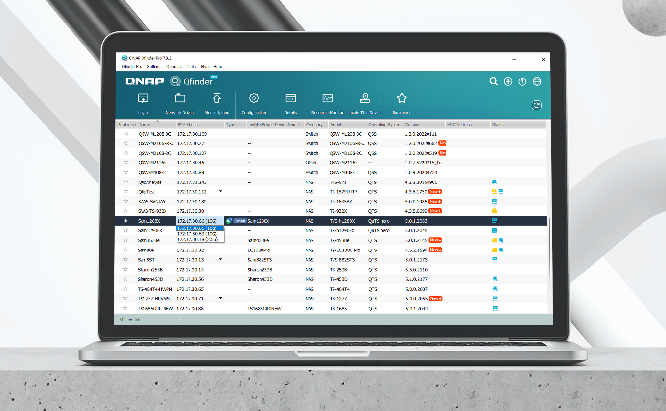 Qfinder Pro 会自动寻找并显示同一局域网络 (LAN) 内的所有 QNAP NAS,让您轻松地联机与管理多个设备。Qfinder Pro 让您无须登入网页接口,即可编辑 QNAP NAS 的设备设定并监控系统状态,让日常工作更加方便。