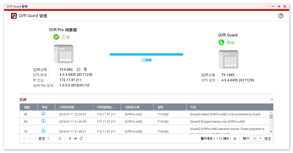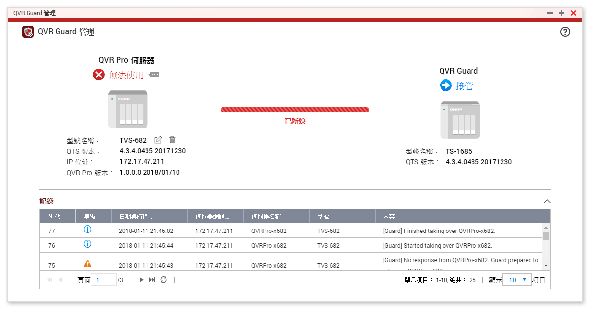 QVR Guard 桌面任务栏清楚地呈现目前系统工作模式,让管理者轻松掌握 QVR Pro 运作状态。QVR Guard 系统记录 (Logs) 亦详细显示故障接管的时间与执行内容,管理者可随时查阅,在第一时间进行故障排除,及时恢复 QVR Pro 录像系统正常运作。