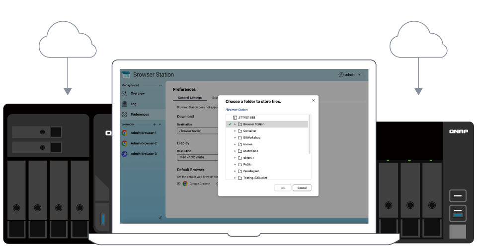 使用者通过 Browser Station 浏览网页并下载文件时,可自定义档案储存路径。不论是下载 Email 附件或是网页上的档案,将直接储存到 NAS 中预设的下载文件夹里。