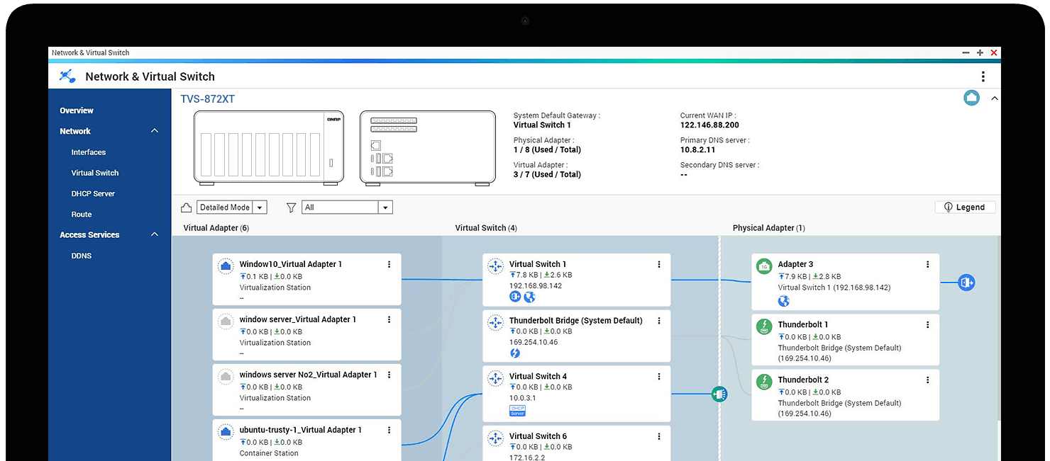 网络与虚拟交换器 (Network & Virtual Switch) 可让 TVS-872XT 上的实体适配卡 (网络适配器、Thunderbolt™ 传输埠) 和虚拟接口卡 (虚拟机和软件容器) 彼此通讯,并提供可视化的网络拓朴图,清晰呈现虚 / 实网络的串连架构,让您一目了然。弹性的管理架构让虚 / 实网络服务可拆解、可重组,依您的需求随时调整 TVS-872XT、虚拟机和软件容器应用所需的优化网络资源。网络分流确保应用高性能,而网络资源调度更富有弹性。