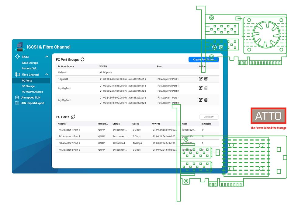 您可选购 Marvell®、ATTO® 或 QNAP Fibre Channel 卡安装于兼容的 QNAP NAS,并利用 QTS 的 iSCSI & Fibre Channel 应用进行 Fibre Channel Target 设定,即可轻松将 NAS 加入 SAN 环境。此外,LUN Masking (LUN 遮蔽) 与 Port Binding (端口聚合) 功能更为您的数据提供多一层的安全保护。