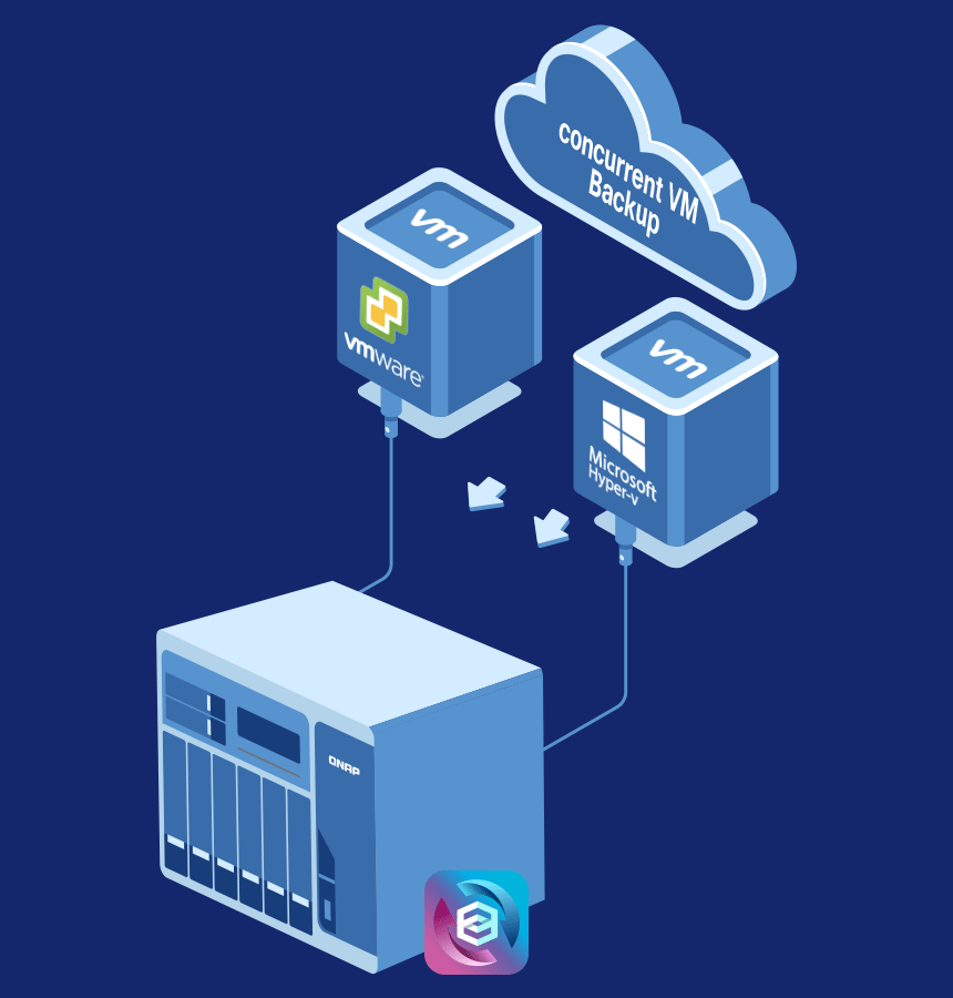 备份虚拟机不再需要软硬分离。只要一台 QNAP NAS 搭配 Hyper Data Protector 应用,免授权安装、无需代理程序即可备份 VMware® vSphere 与 Microsoft® Hyper-V 上的虚拟机。Hyper Data Protector 具备来源端增量备份 (Incremental Backup)、全局重复数据删除 (Global Deduplication)、计划备份,以及还原压缩传输功能,大幅节省备份时间、存储空间与还原时间,打造更效率的虚拟机备份及灾难复原方案。