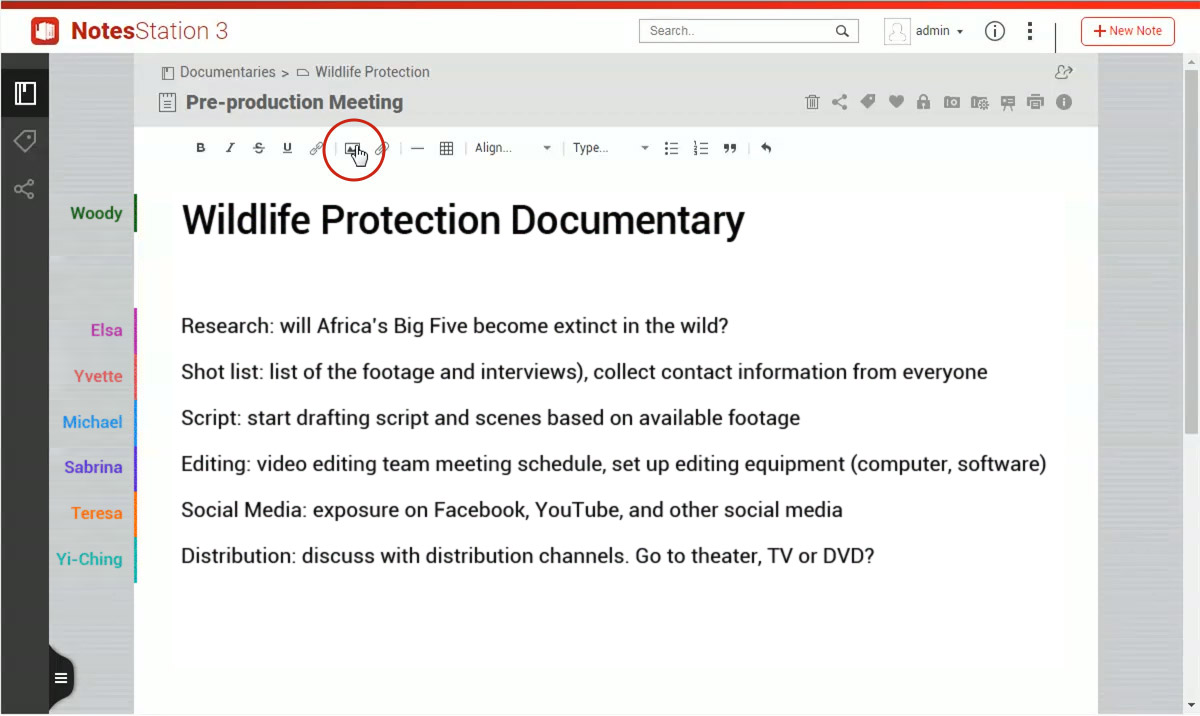 为笔记建立公开链接,即可分享给其他共享同一台 NAS 的成员,立即展开共同协作。多人实时协作笔记,也特别适合用于会议及讨论记录。笔记左侧会显示每个段落的编辑人员,让您快速分辨编辑者,并进行后续讨论。