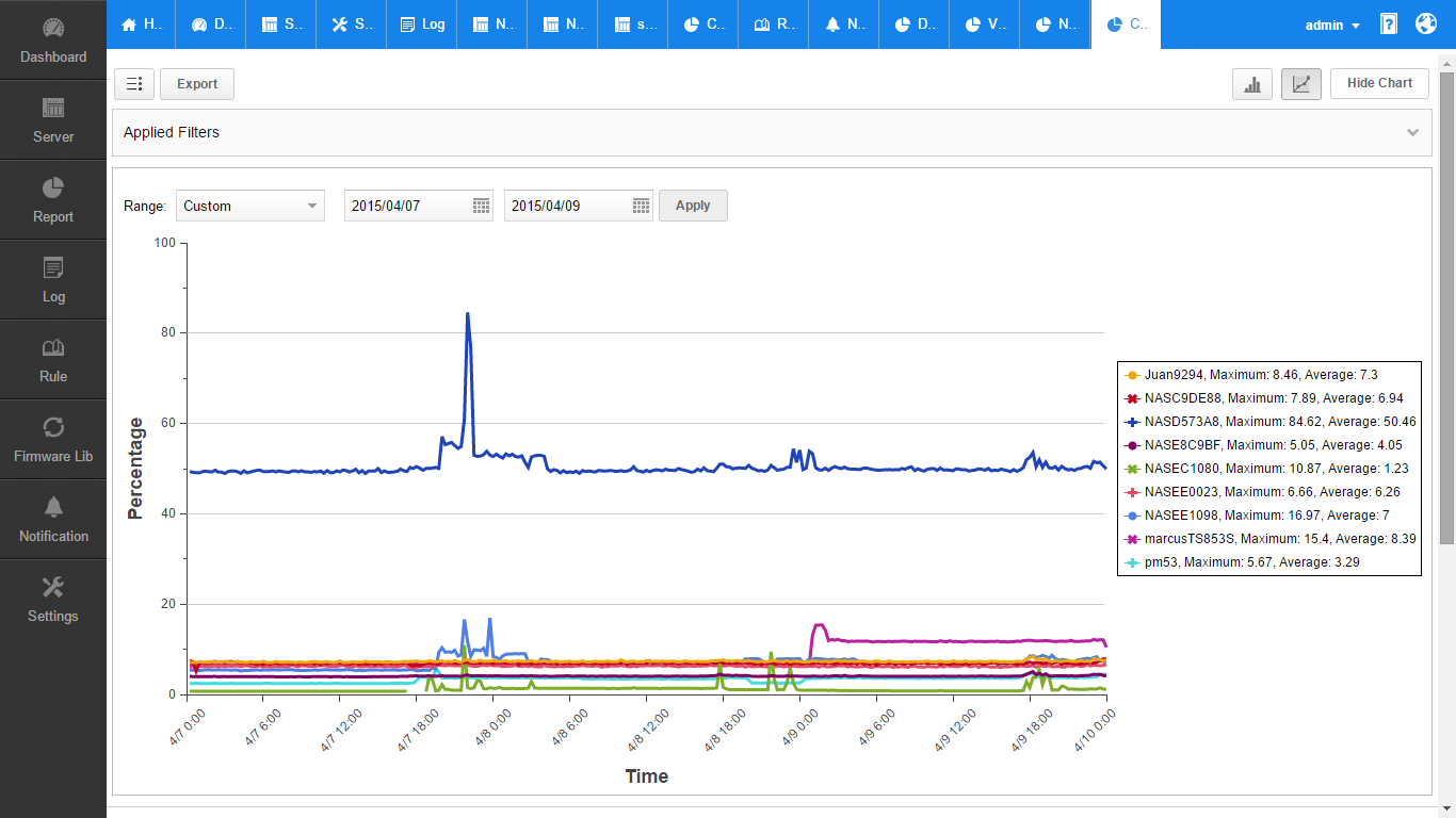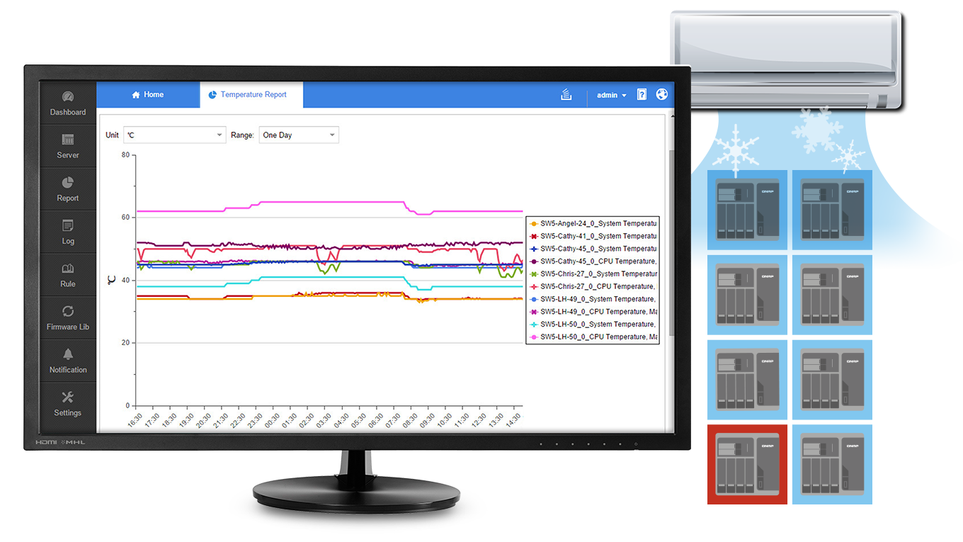 Q’center 提供详细系统资源运用报告。例如温度及风扇转速监控报告,可降低因系统机房空调或其他因素导致设备损坏的风险。您也可以统一套用电源选项,同时设定多台 NAS 定时关机及启动,提升 NAS 系统管理及效率。