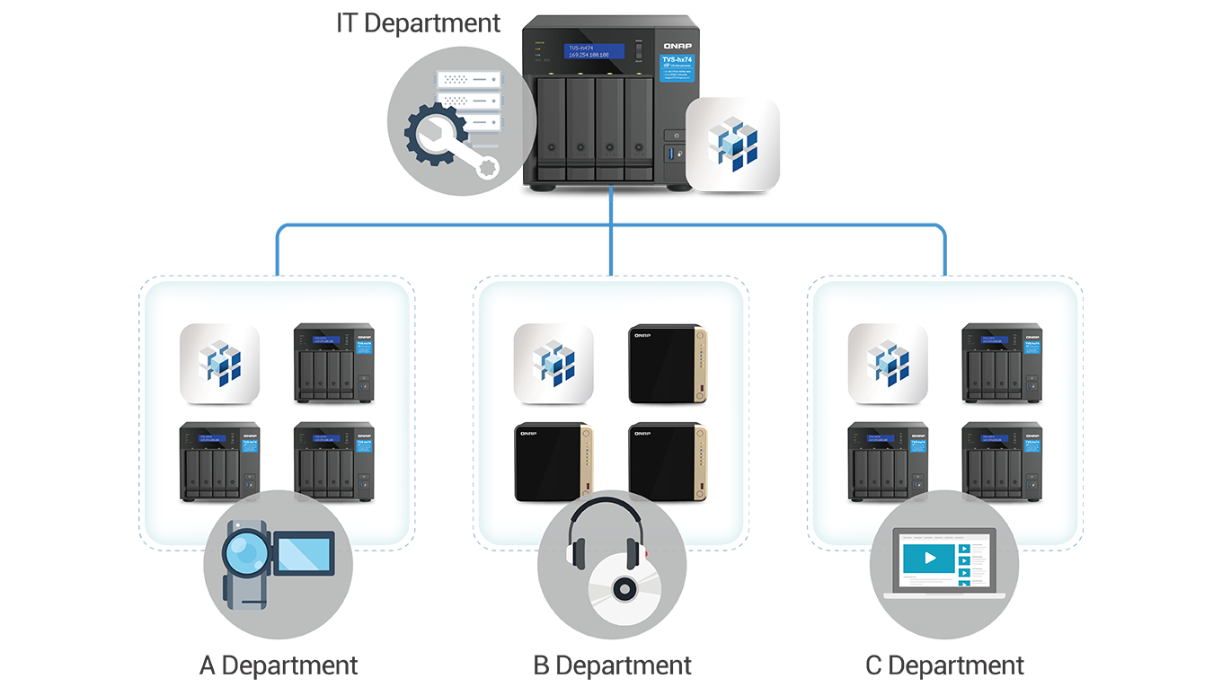 Q’center 突破以往一台服务器集中管理所有 QNAP NAS 的机制,现在每一台 NAS 都可以被多台安装 Q’center 的服务器所共同管理。每个部门或独立单位可以了解分区存储空间使用状态及纪录,同时满足中央资源分配与分区管理两大目标,协助您更有效率地管理 NAS 资产。