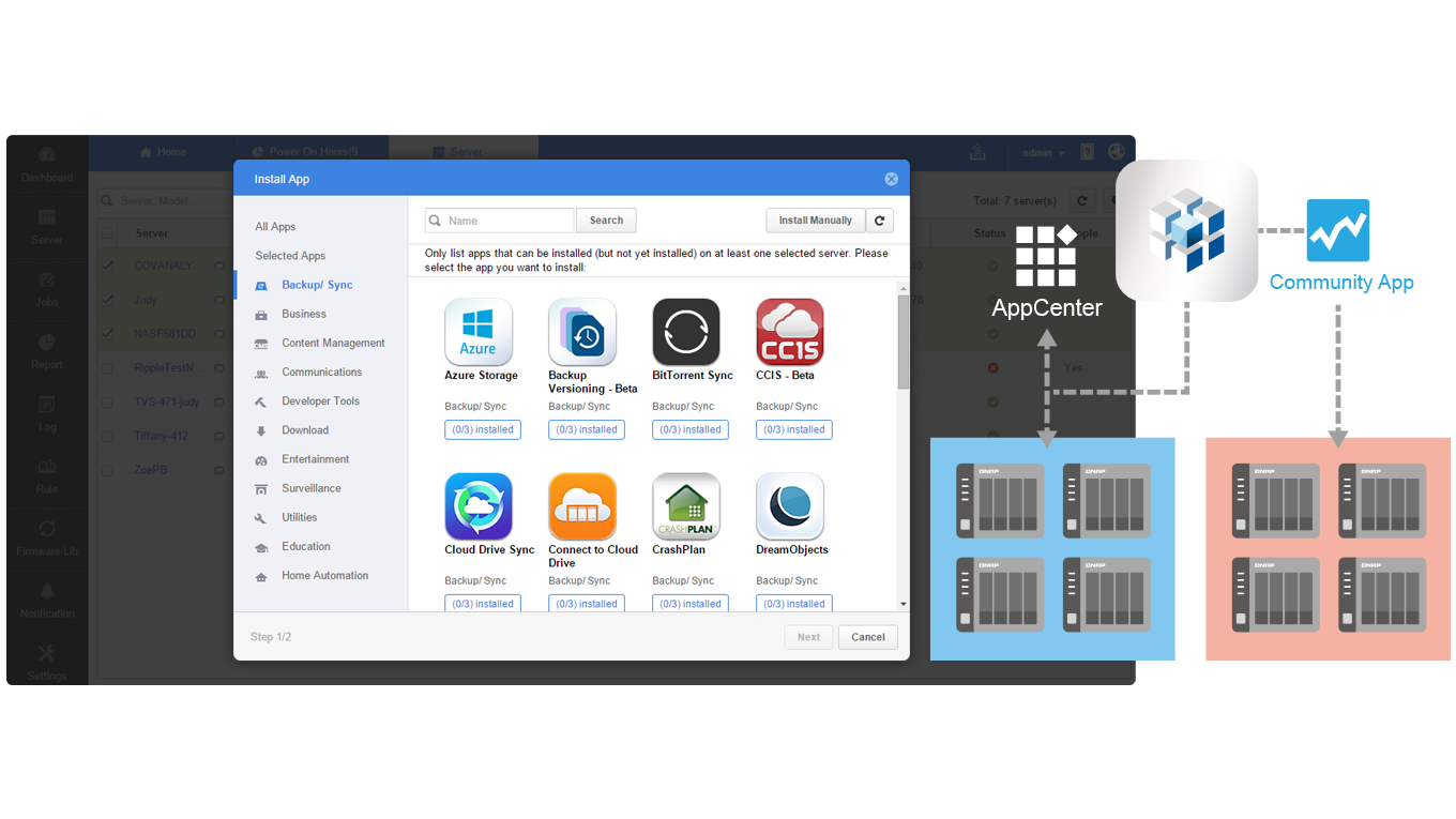 您可通过 Q’center 远程操作,统一分配或让各个 NAS 下载及安装所需的应用程序,以及一次为所有的 NAS 建立新的共享文件夹并调整权限。Q'center 也整合 Windows® Active Directory,让 NAS 用户权力管理更有效率,免除一一设定造成的时间及人力资源耗损。