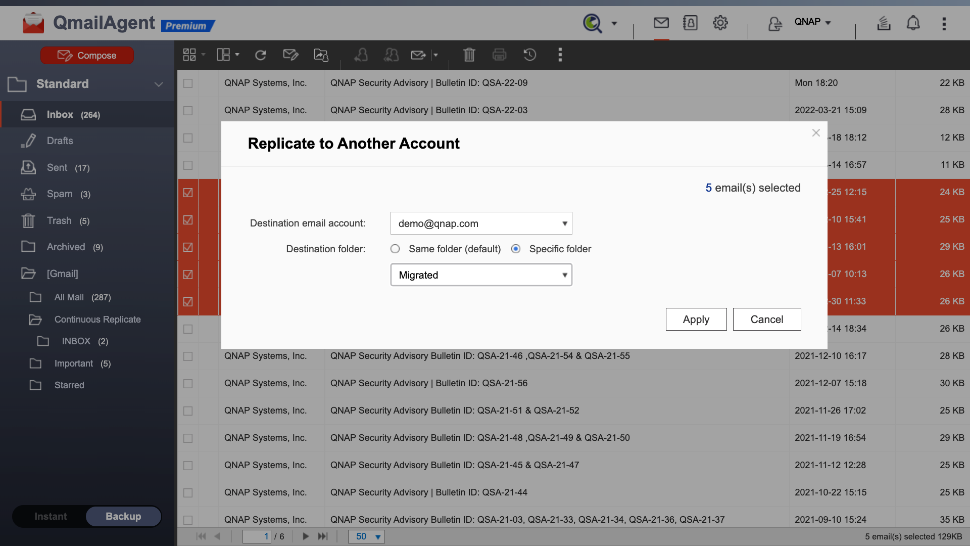 您可灵活选择将特定电子邮件或多个信箱文件夹复制到其他账户。