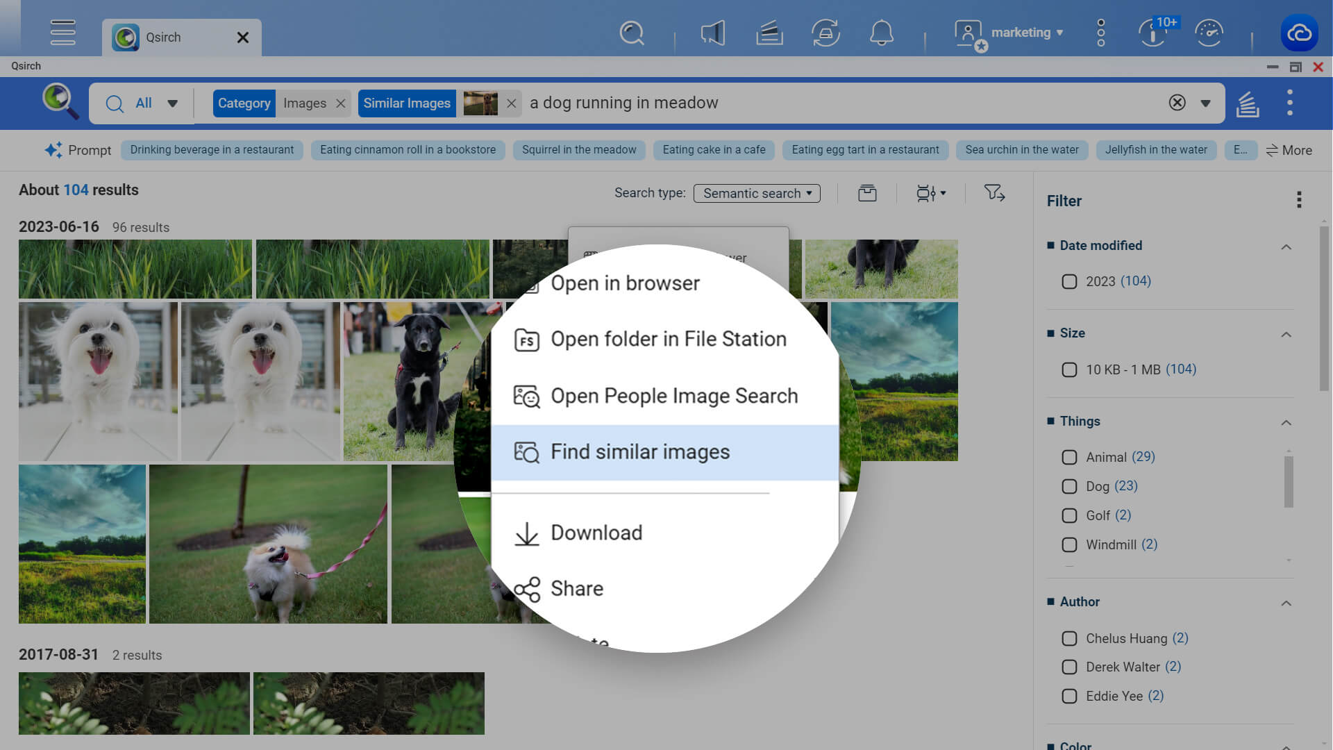 Qsirch 支持 AI 驱动的语意搜索 (Semantic Search) 功能,让图片搜索更准确!您能以更直观且口语化的描述句作为搜索指令 (支持达 23 种语言),缩小搜索范围以达准确的搜索结果,体验更效率的文件搜索。