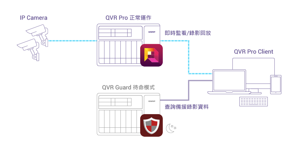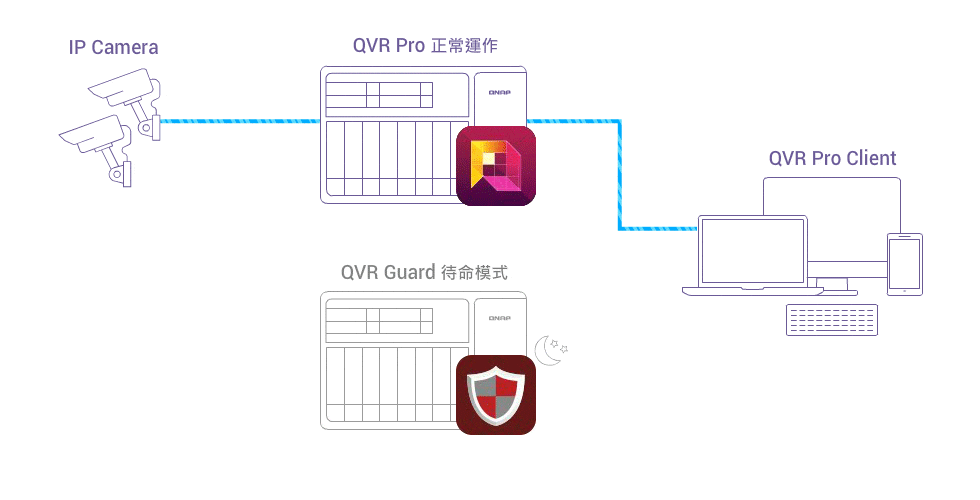 • 当 QVR Pro 运作异常或故障时,QVR Guard 会自动接管录像任务。