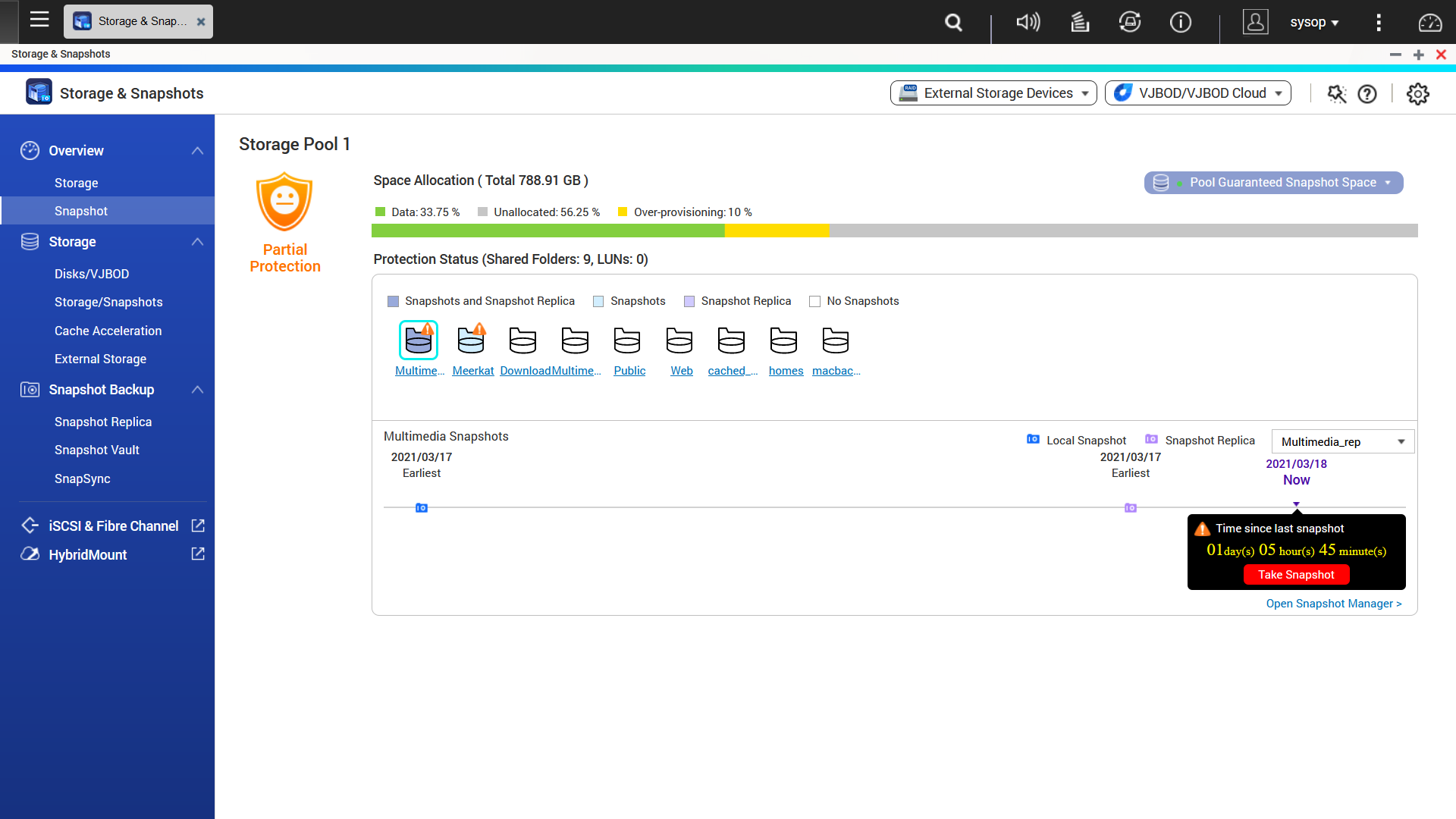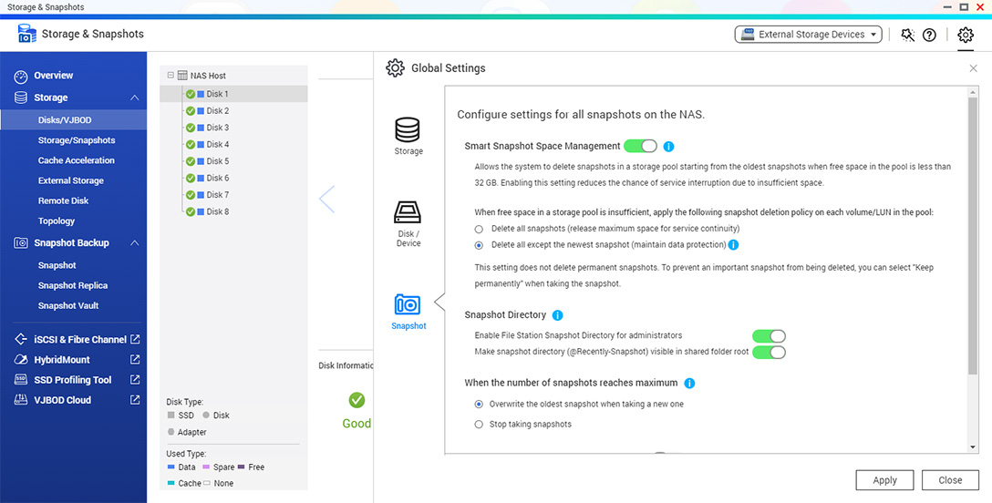 您启用快照功能后,如 NAS 系统的可用空间低于 16GB 时,系统会直接进入保护模式,此时 NAS 将无法再写入数据 (仅能读取与删除)。您可以通过合适的快照空间管理策略,避免发生此状况发生。