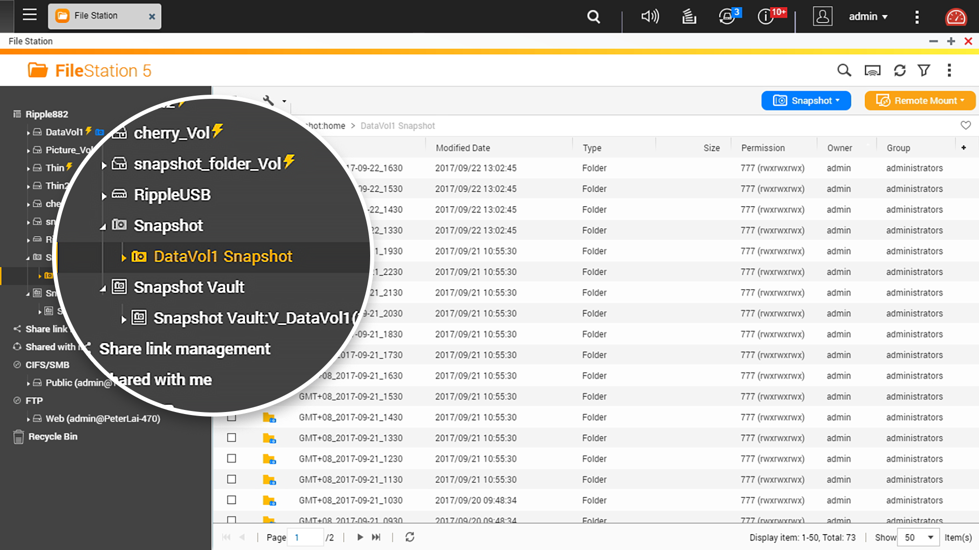 QNAP NAS 支持快照 (Snapshot) 功能,就像照相般,可将任一时间点的系统状态与数据记录下来作为将来还原的备份,且比传统备份使用更少的存储空间。当 NAS 数据毁损或计算机受到加密勒索软件威胁,即可利用快照文件迅速还原,确保重要数据万无一失。