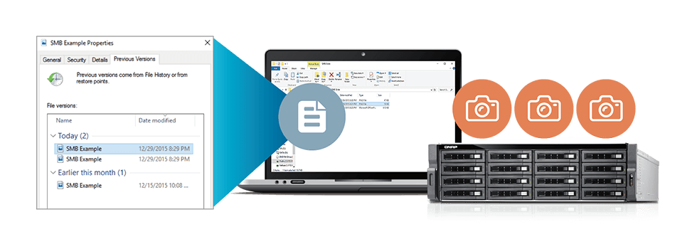 Windows® 用户可以鼠标右键点击 NAS 上的文件,通过文件总管中「以前的版本」功能,直接还原 NAS 上的文件。此举不仅缩短还原时间,更可简化管理员工作 (一般用户可自行还原文件,不用通过管理员)。
