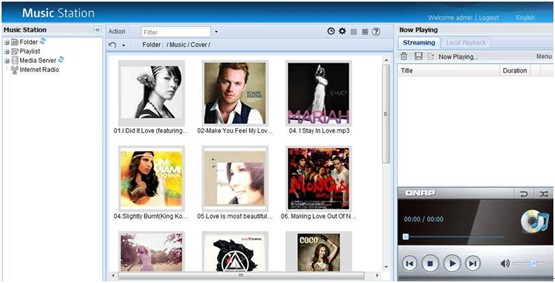 不需要安装额外的软件,Music Station可于市面上各大浏览器,诸如Internet Explorer、Chrome、Firefox上完美运作。用户可以依照专辑或个人化的音乐列表选择要播放的音乐。方便起见,还可以快速通过专辑封面选取要播放的音乐。