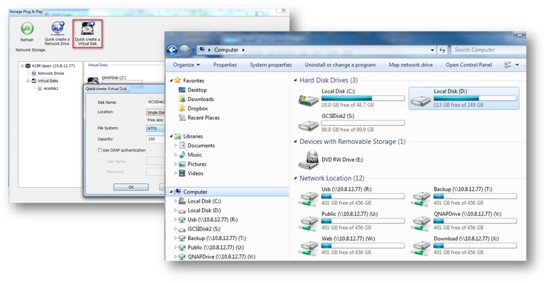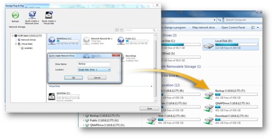 为了扩充PC计算机的存储空间,而必须拆机安装硬盘,或建立iSCSI SAN,真是一个大麻烦。从现在起,装有Windows版本QNAP Finder的PC计算机或服务器,可以简易地通过联机网络驱动器或是虚拟磁盘的方式来扩充存储空间。