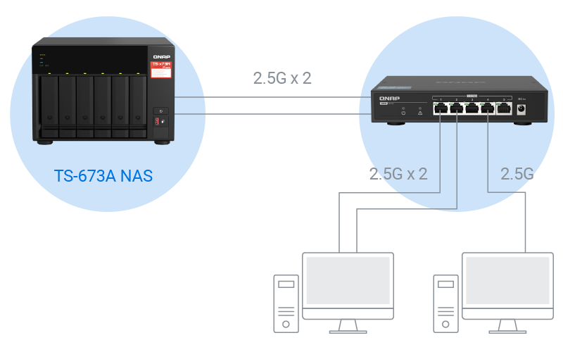 为 TS-673A NAS 启用 SMB Multichannel (多重通道),即可聚合双端口 2.5GbE带宽达 5Gbps 传输能力,更适合大型文件、多媒体影音传输应用。
