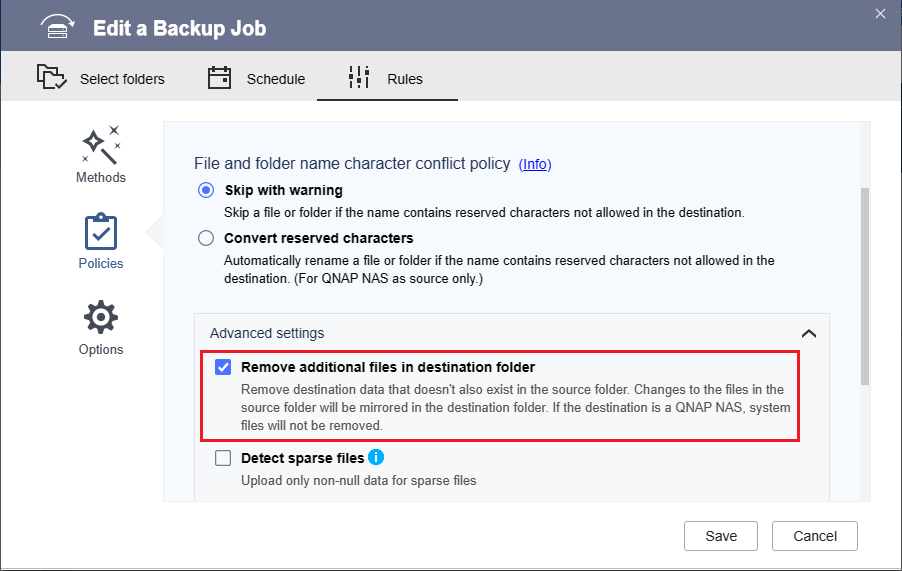 - 在备份作业中启用移除目标文件夹中的其他文件。