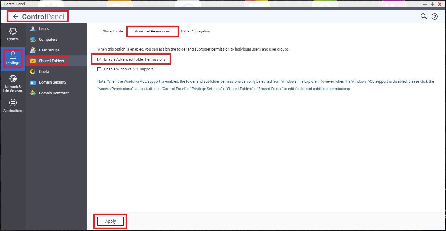 - 转到“Privilege”(权限)>“Shared Folders”(共享文件夹)>“Advanced Permissions”(高级权限)。