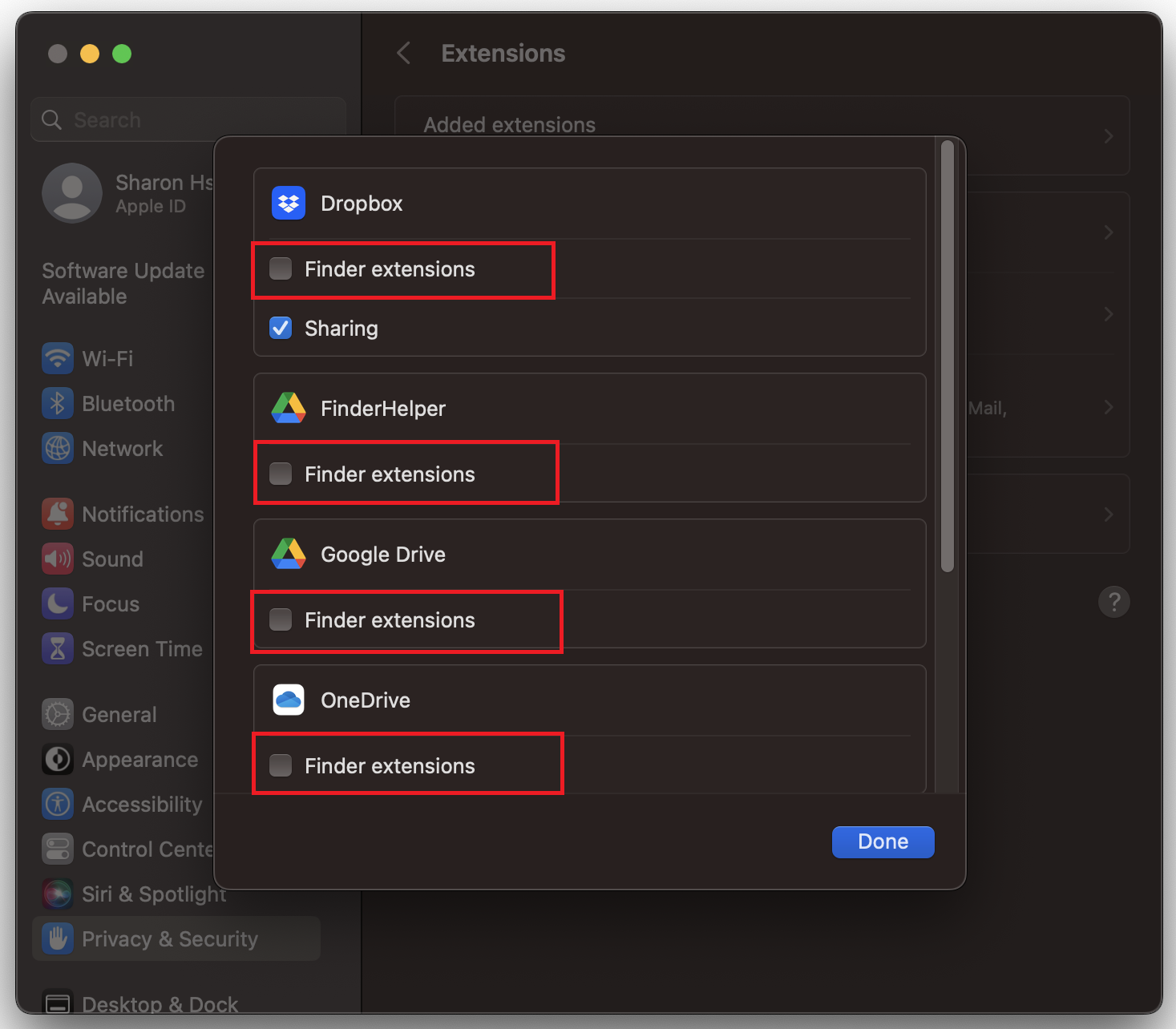 3. 重新启用所有“访达扩展”选项,然后单击完成
