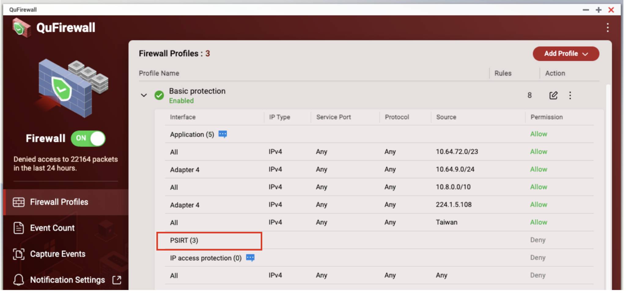 FAQQTSQuTS hero存储QuFirewall 什么是 QuFirewall 中的 PSIRT 界面? 最后修订日期: 2022-12-17 适用产品QuFirewall详细信息PSIRT 是指 QNAP Product Security Incident Response Team。此团队会定期更新构成安全威胁并阻止与其关联的所有 IP 地址的勒索软件列表。QuFirewall 基本保护中的 PSIRT 是因与恶意软件和其他恶意活动相关联而被阻止的 IP 地址列表。 这篇文章有帮助吗? 是 否 谢谢您,我们已经收到您的意见。 请告诉我们如何改进这篇文章: 这篇文章缺了重点讯息 这篇文章的解决方案没有用 这篇文章太过复杂 这篇文章包含了不正确的讯息 这篇文章的信息已过时 如果您想提供其他意见,请于下方输入。 如果您想提供其他意见,请于下方输入。