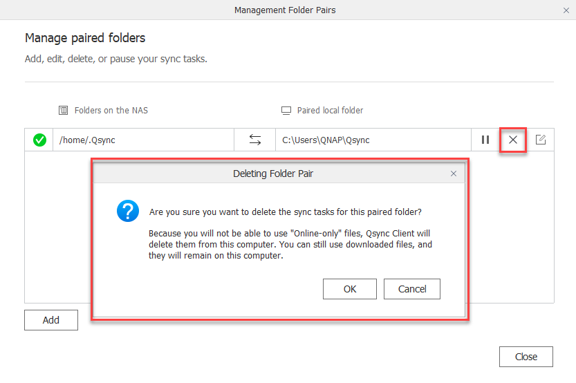 如果为配对文件夹启用了节省空间模式,Qsync 会创建运行节省空间模式所需的与配对文件夹关联的数据。此数据存储在配对文件夹中。如果配对文件夹存储在外部硬盘上,接着将此硬盘移动到其他计算机,Qsync 将无法在新计算机上利用此数据运行节省空间模式。因此,作为一种预防性措施,Qysnc 将无法重新配对文件夹。