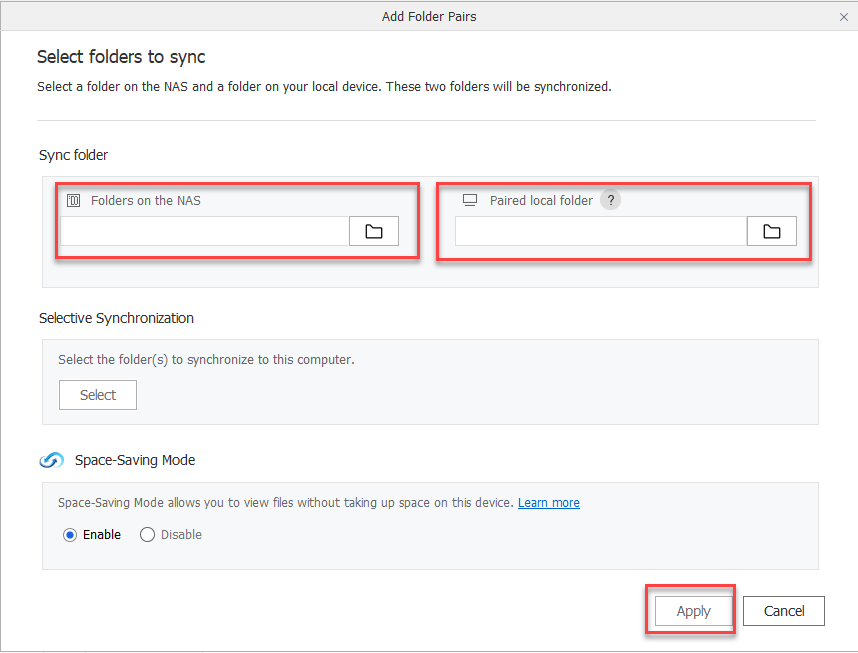 4. 在“Sync Folder”(同步文件夹)>“Folders on the NAS”(NAS 上的文件夹)下,指定 NAS 文件夹。