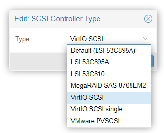 • 如果使用的是 QEMU 或 Proxmox 等虚拟机监控程序,请检查 SCSI 控制器类型。默认类型 (LSI 53C895A) 仅支持 14 个磁盘。要使用 14 个以上的虚拟磁盘,请将 SCSI 控制器类型更改为 VirtIO SCSI