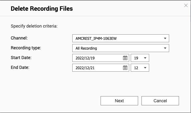 4. 在“Delete Recording Files”(删除录像文件)窗口中,指定删除条件,然后单击“Next”(下一步)。