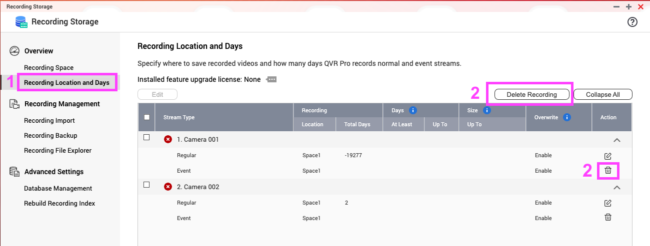 3. 单击“Delete Recording”(删除录像),删除第一个默认摄像头的录像,或在“Action”(操作)列下单击单个摄像头对应的垃圾桶图标,删除该摄像头的录像。