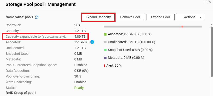 请注意,仅当存储池已准备好进行扩展之前,才会出现扩展容量按钮。例如,如果您已配置配备三个 1 TB 磁盘且总存储容量为 2 TB 的 RAIDZ1 (RAID 5) 存储池,您希望将池的总存储容量扩展为 4 TB(使用相同 RAID 类型),则需要将这三个 1 TB 磁盘全部更换为 2 TB 磁盘。更换所有磁盘后,页面上将自动出现“Expand Capacity”(扩展容量)按钮,有关扩展后的大致池容量的信息会相应更新。