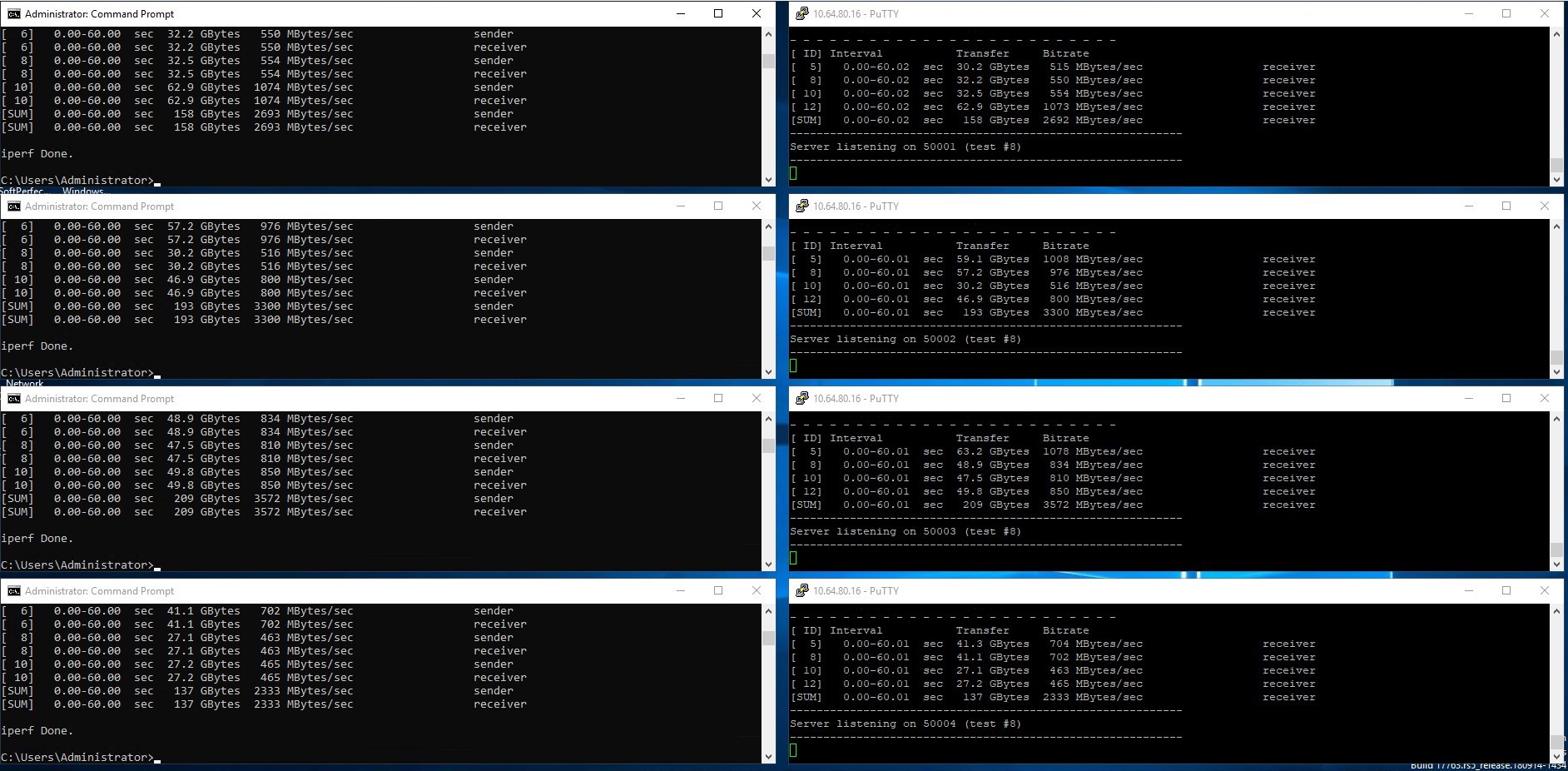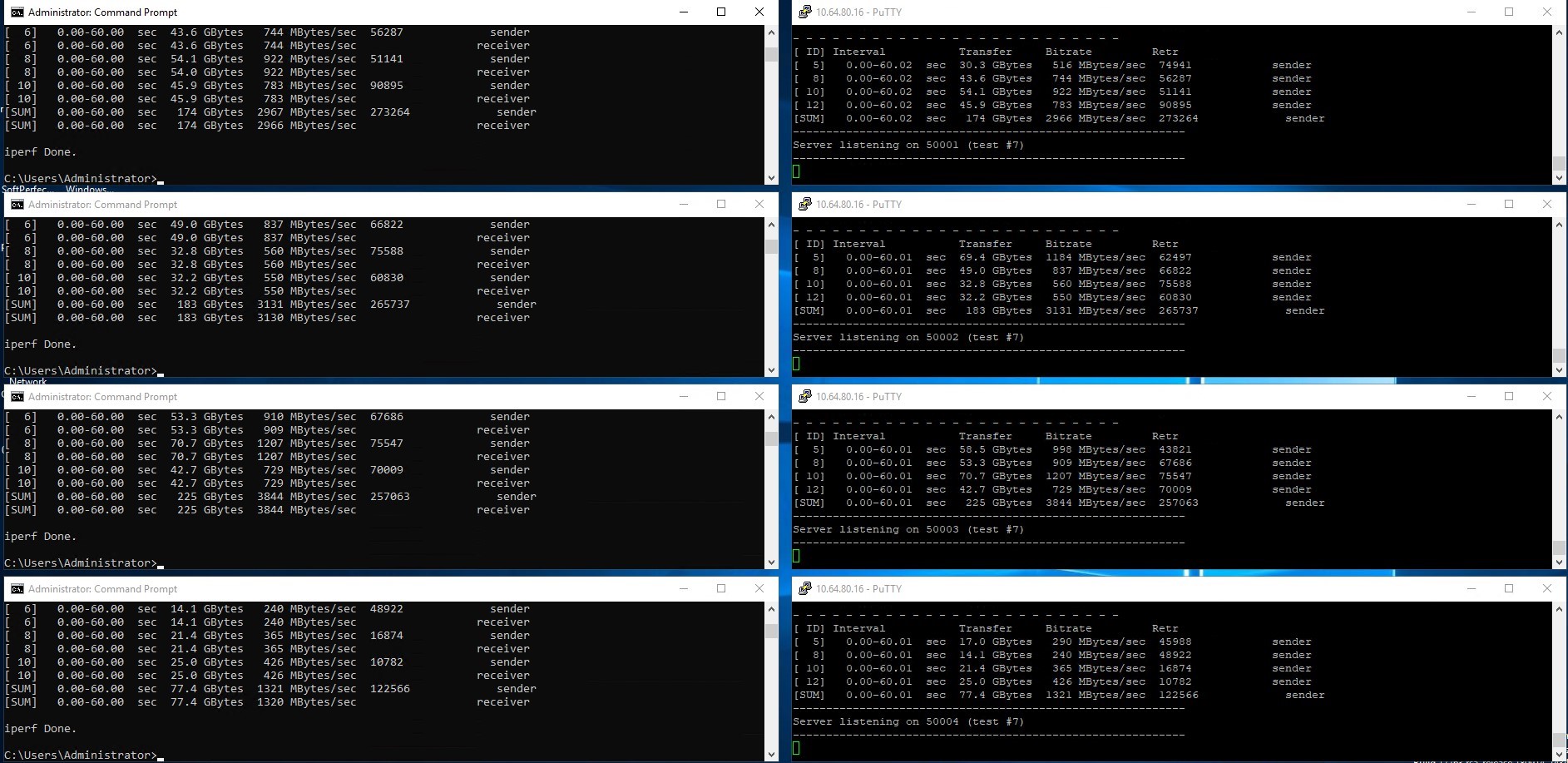 iperf3 -c <IP> -f M -i 1 -P 4 -t 60 -p 50001 & iperf3 -c <IP> -f M -i 1 -P 4 -t 60 -p 50002 & iperf3 -c <IP> -f M -i 1 -P 4 -t 60 -p 50003 & iperf3 -c <IP> -f M -i 1 -P 4 -t 60 -p 50004 &