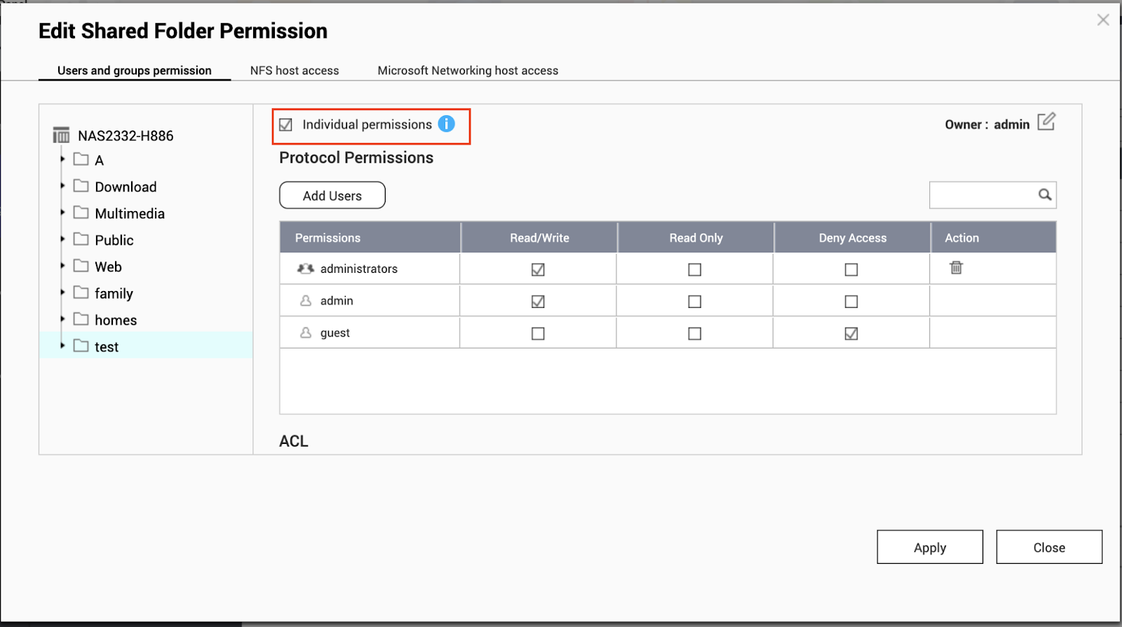 QuTS hero has multiple permission combinations and sometimes can be a little bit confused how to manage subfolders permissions to work with SMB. First of all you need to enable individual permissions,