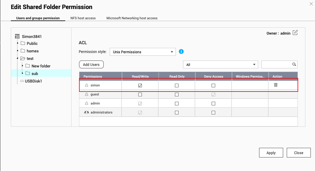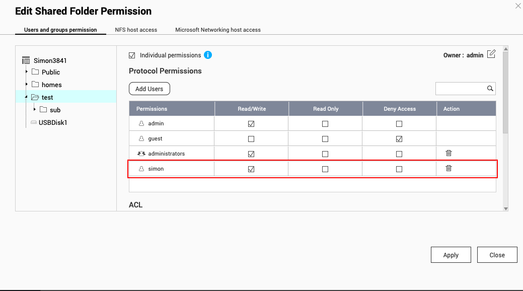 Then in Protocol permission of the root shared folder we assign R&W permission to the user (in our example root shared is "test” and the user is “Simon")